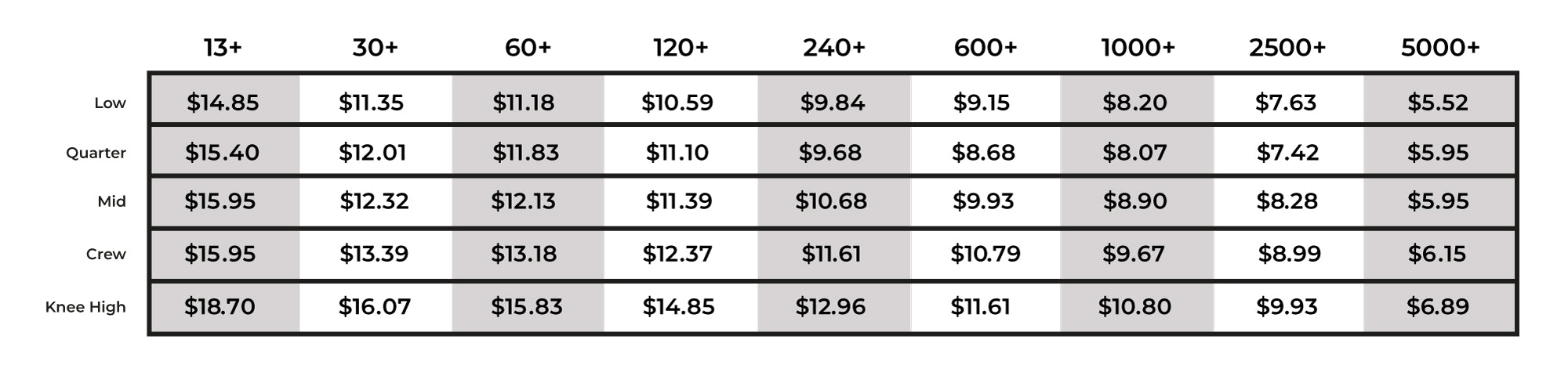 Each sock starts as a pre-knit base with a 3.5 x 4.5-inch design space - this is a fully customizable window where we can dial in logos, trademarks, and even PMS color match to meet all of your specifications.